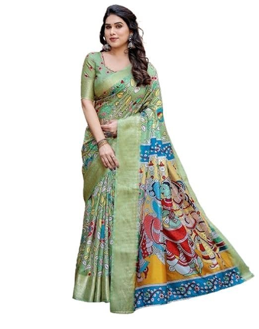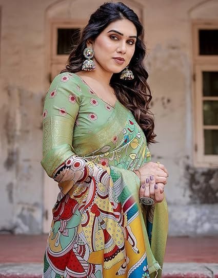- Saree Details : Saree Fabric: Silk | Blouse Fabric: Tussar Silk | Saree Work: Kalamkari Printed, Jacquard, Tassels | Blouse Work: Printed, Weaving Border | Saree Color: Pista Green & Multi | Blouse Color: Pista Green