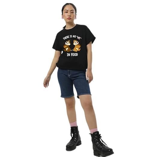 This Official Disney No We in Food Women’s Boyfriend T-Shirt is for you to set the ground rules while you are enjoying your meals. Style this black t-shirt with comfy joggers, funky sliders and tote bag for an effortless look.